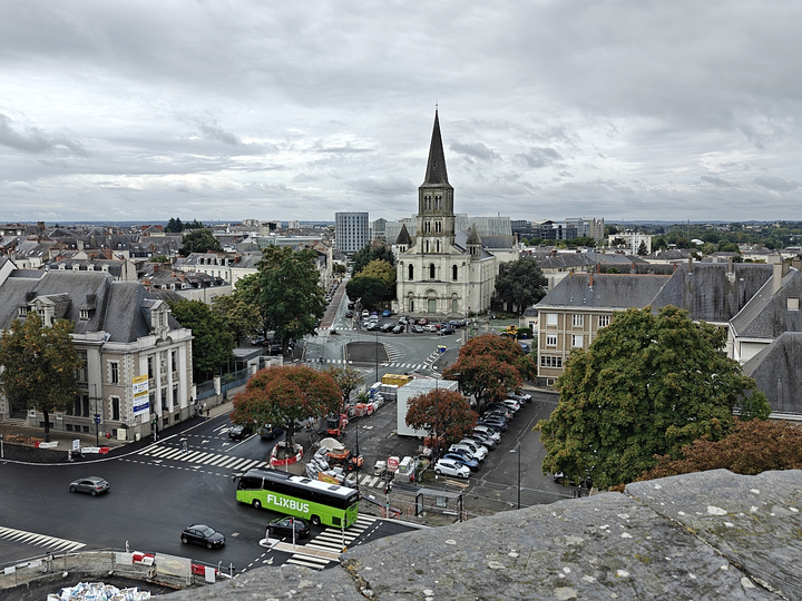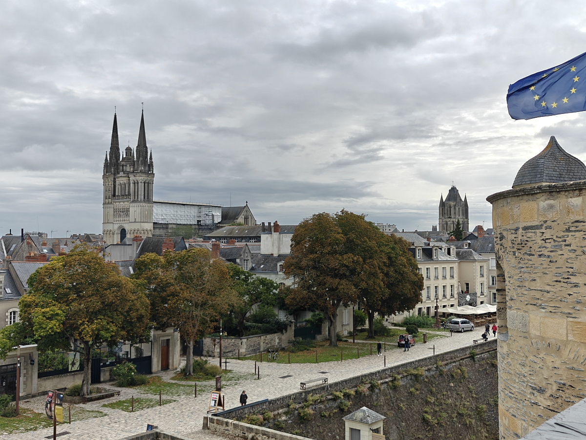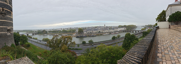 Перед входом в замок (Château d'Angers) с правой стороны расположена смотровая площадка, с которой открывается панорамный вид на реку Мен и правобережную часть города:
